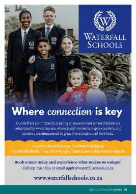 Book a tour today and experience what makes us unique! Call 031 710 1824 or email apply@waterfallschools.co.za www.waterfallschools.co.za EDUCATION & TRA INING I31