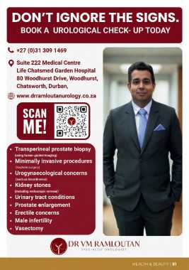 ~ +27 (0)31 309 1469 Q Suite 222 Medical Centre Life Chatsmed Garden Hospital 80 Woodhurst Drive, Woodhurst, Chatsworth, Durban, ~ www.drramloutanurology.co.za HEALTH & BEAUTY I 51