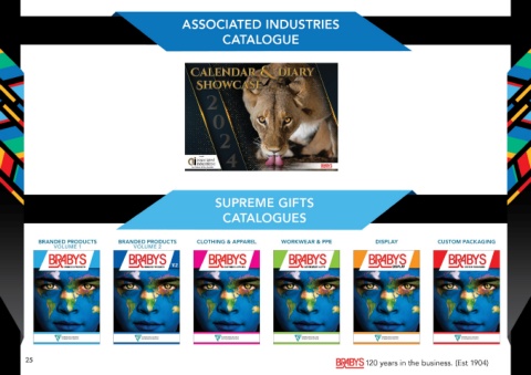 ASSOCIATED INDUSTRIES CATALOGUE ri associated industriesv Cohndo, SUPREME GIFTS CATALOGUES BRANDED PRODUCTS BRANDED PRODUCTS CLOTHING & APPAREL WORKWEAR & PPE DISPLAY CUSTOM PACKAGING VOLUME 1 VOLUME 2 25 BRABYS 120 years in the business. (Est 1904)