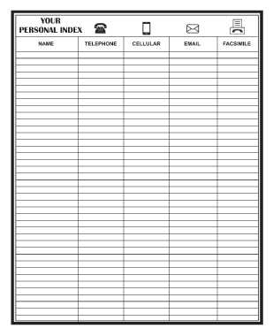 YOUR 0'1 FACSIMILE PERSONAL INDEX IIIX NAME TELEPHONE CELLULAR EMAIL