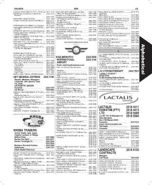 KALEMA INVESTMENTS (PTY) LTD Eveni . 2410 1316 KHULUMA DOT COM Sales Hse Bldg ............ 2404 7792 KWALUSENI ALLIANCE CHURCH .................... 2518 4710