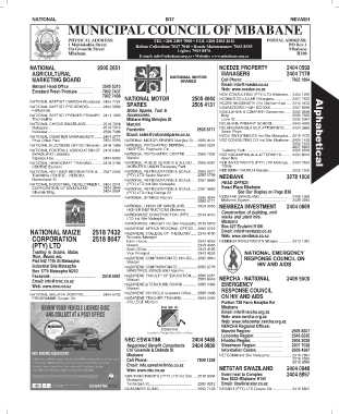 NATIONAL BAPTIST CHURCH Woodlands. 2404 7791 NATIONAL MOTOR 2505 4044 NCOBA'S CELLULAR Nhlangano........................ 2207 7522