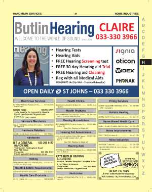 BIG DADDY HARDWARE 22 Harvard St .......... 069 744 1650 KATE BUTLIN HEARING SOLUTIONS Howick . 072 970 9427