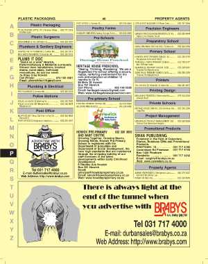 A Plastic Packaging POST OFFICE 1 Somme St................................ 033 330 4600 LITTLE KIDS ACADEMY 53 Plane Cres............ 082 787 3866