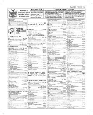 33 Krupp St Southern Industria Box 86138 PORFIRIO MARIA................................................ 26 4806 Ranonkel St Khomasdal PRINTING & STATIONERY WORLD CC.... 30 9999