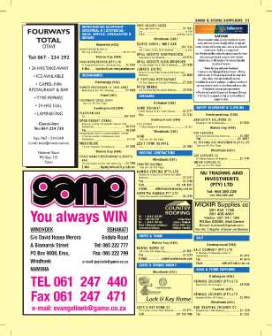 1 Av C/o Vrederede & Swakopmund...................... 40 5345 Tel.......................................................................... 30 2689 See our Ad This Page